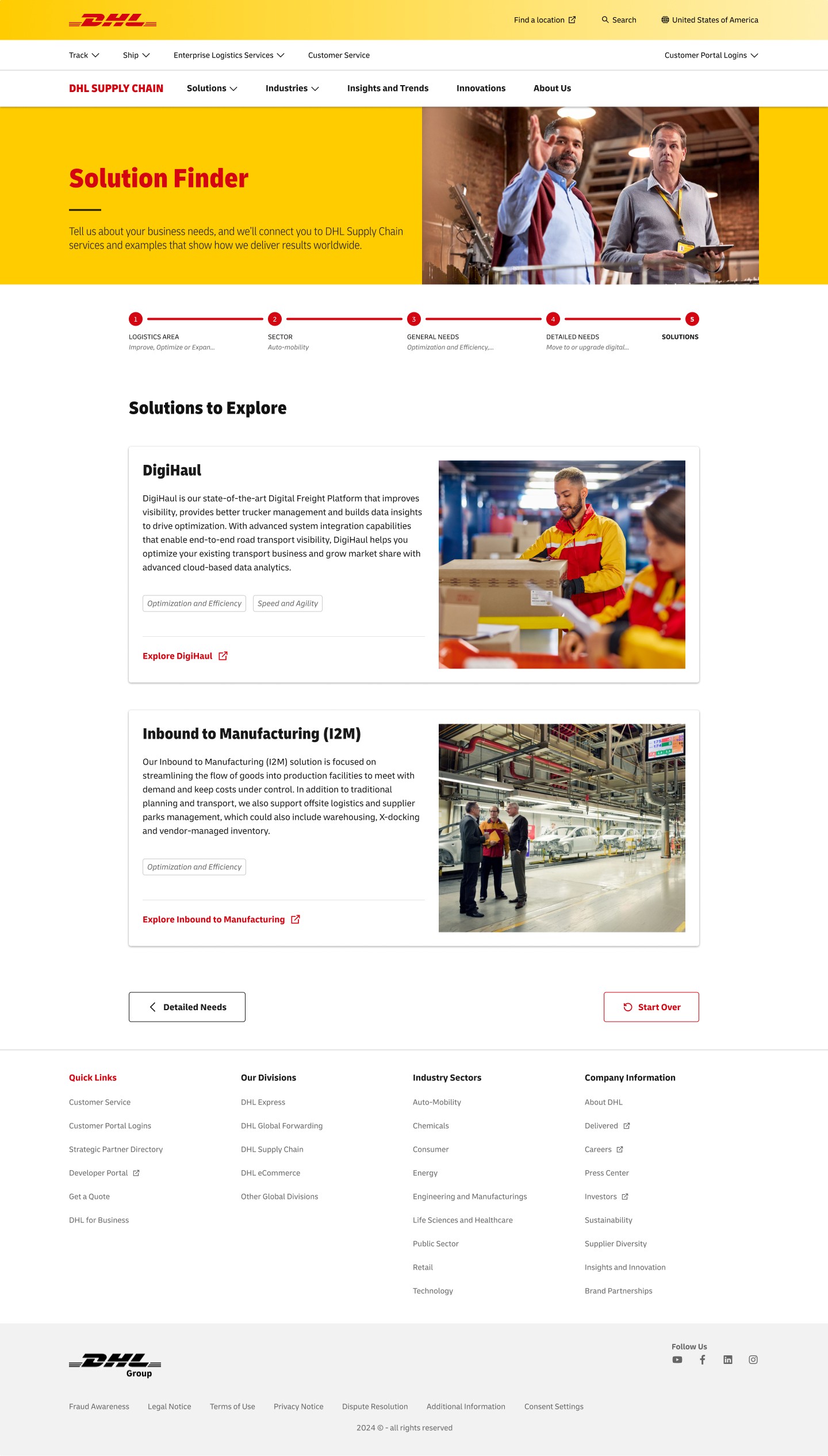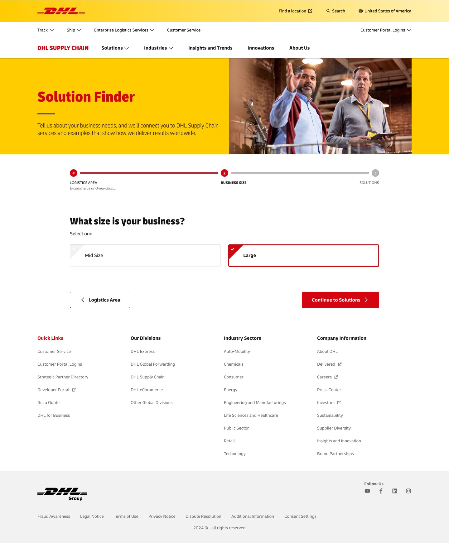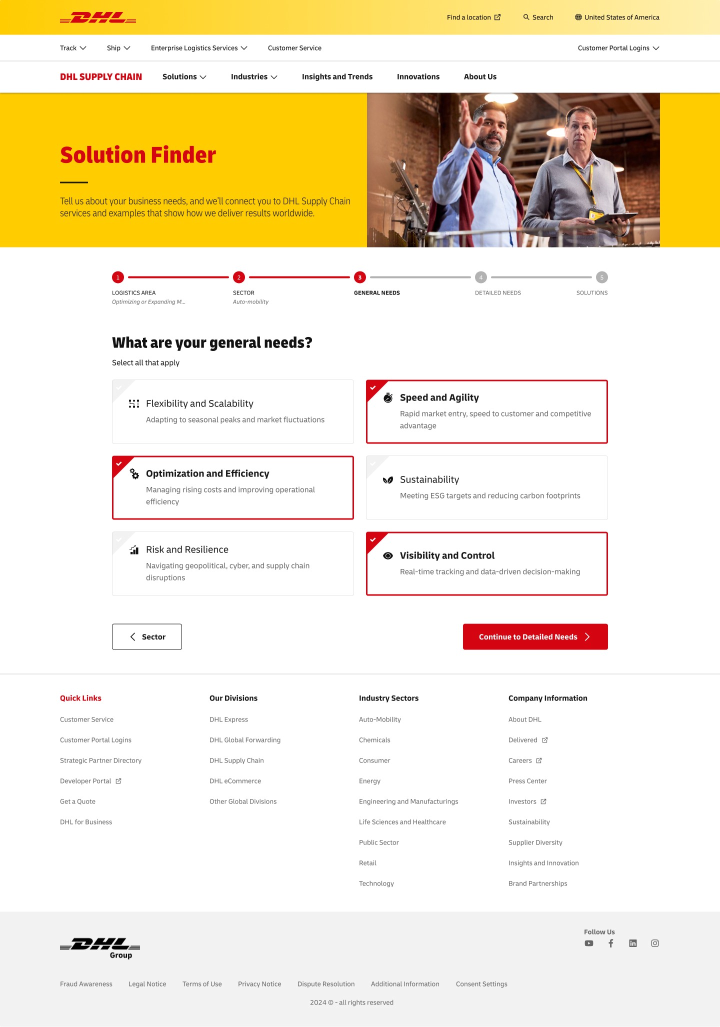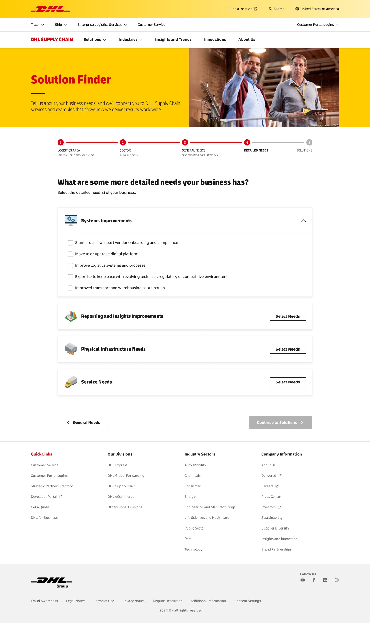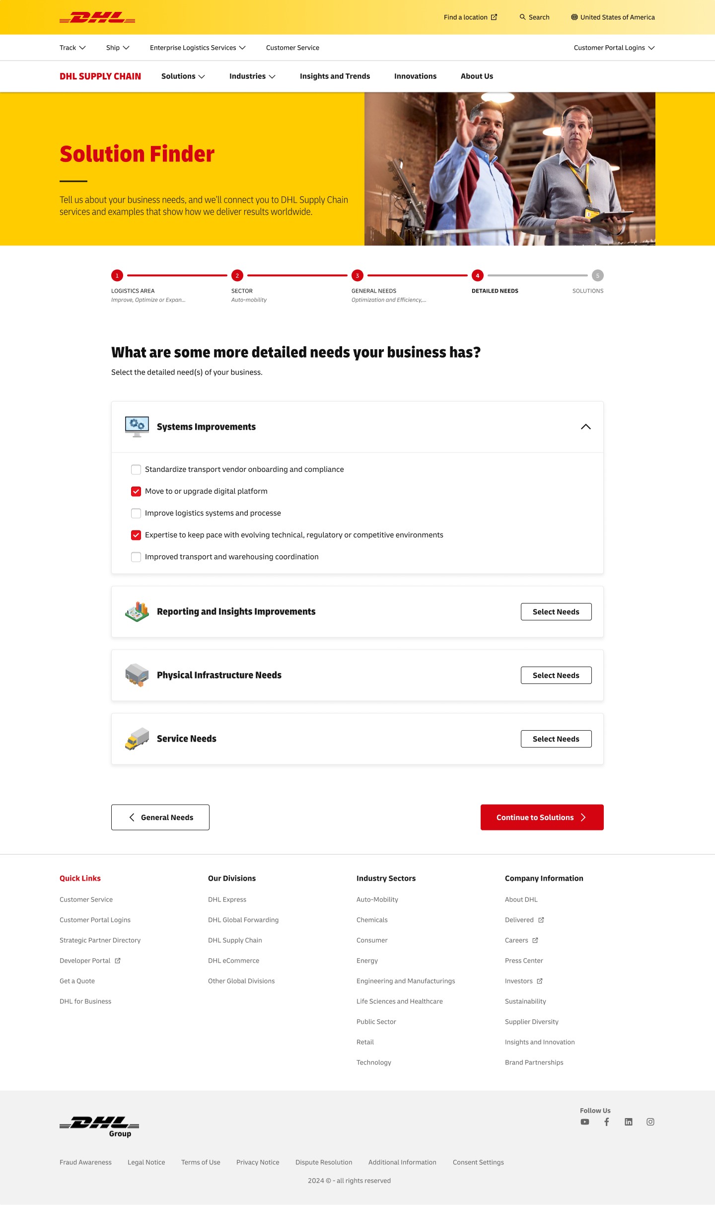 This is the most complex flow of this experience. It is designed to ask a series of questions to help narrow down what solutions the customer needs and connect them to more information. The biggest challenge with this design was the detailed needs section. Narrowing down was difficult with the data, so our team landed on this accordion approach to help divide them into sections to not overwhelm the user.