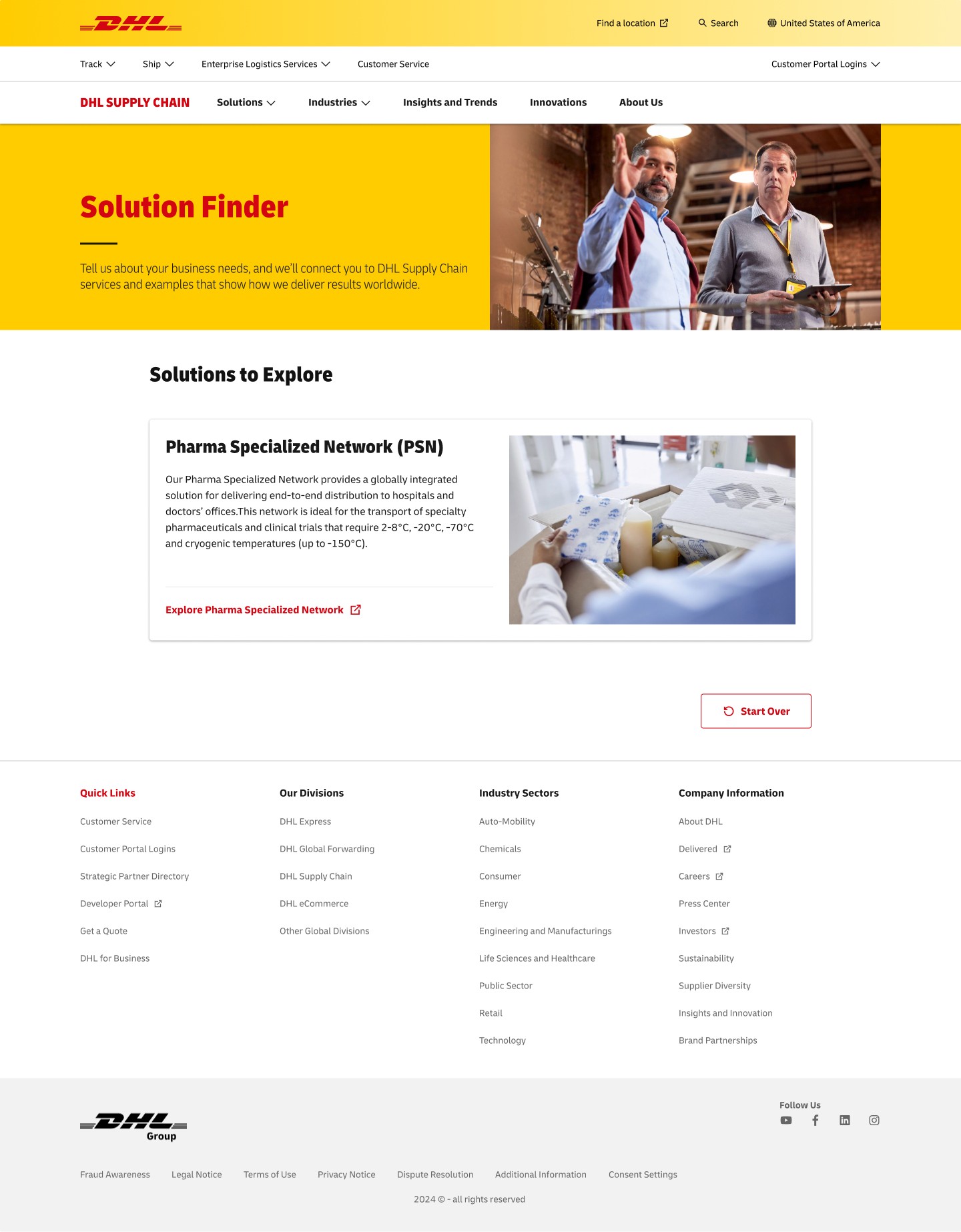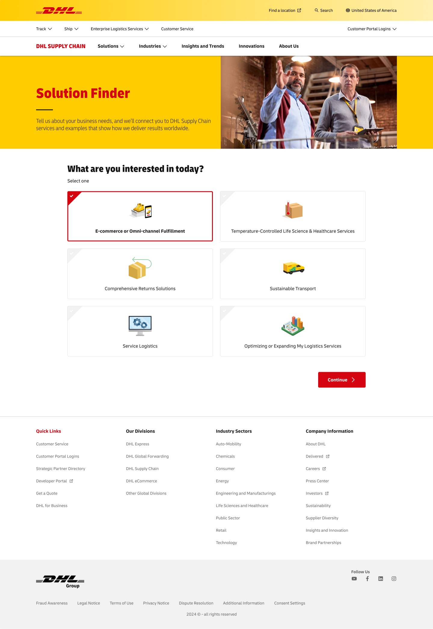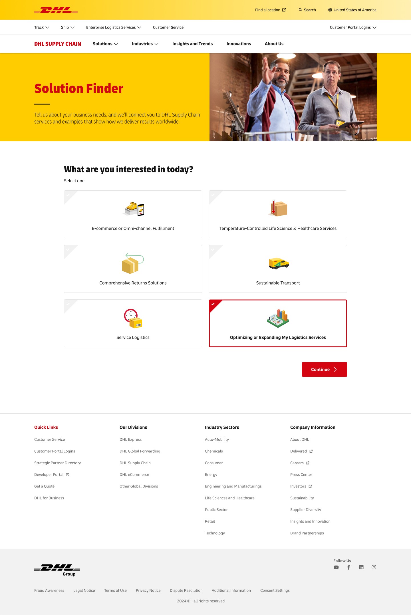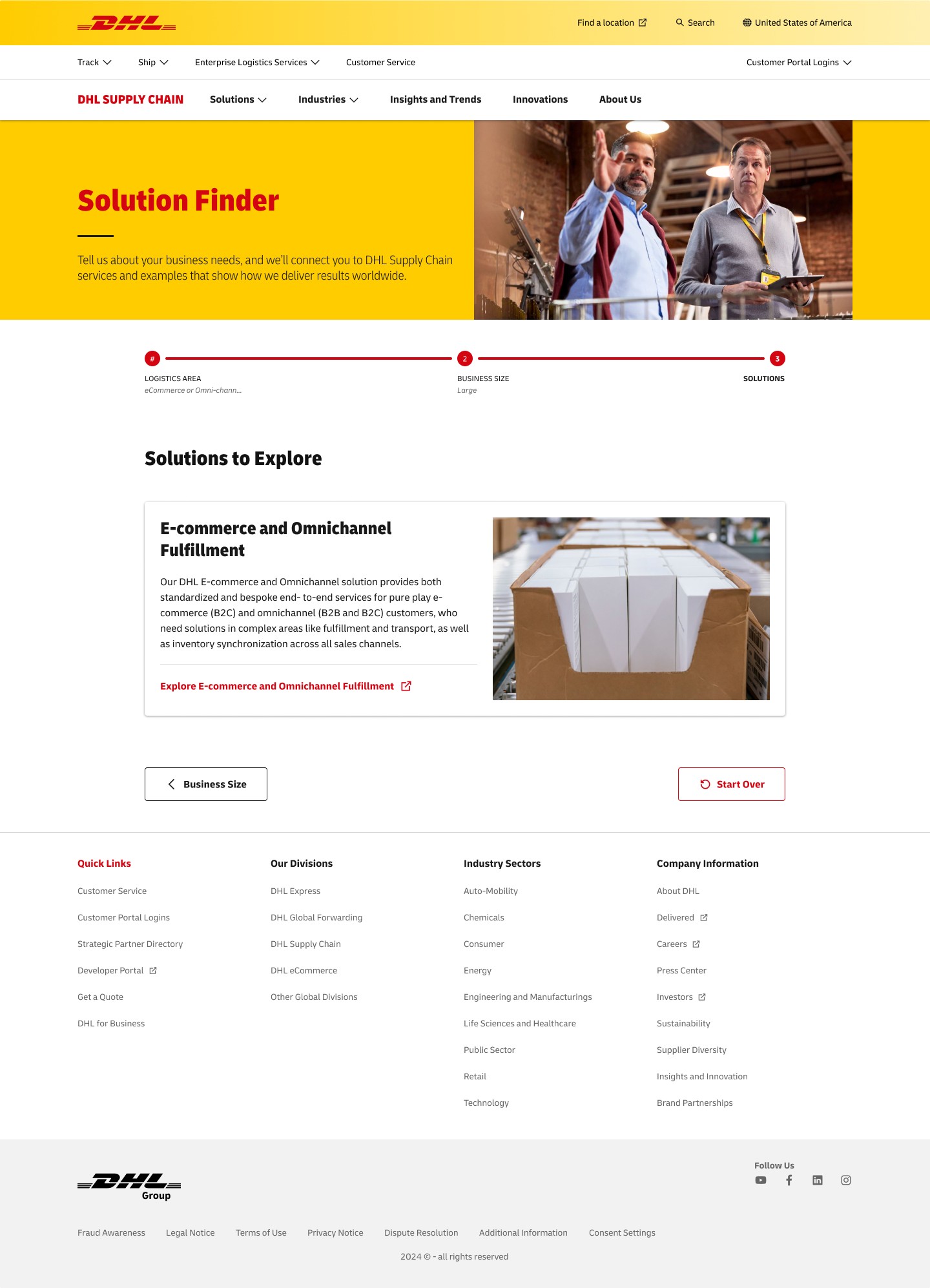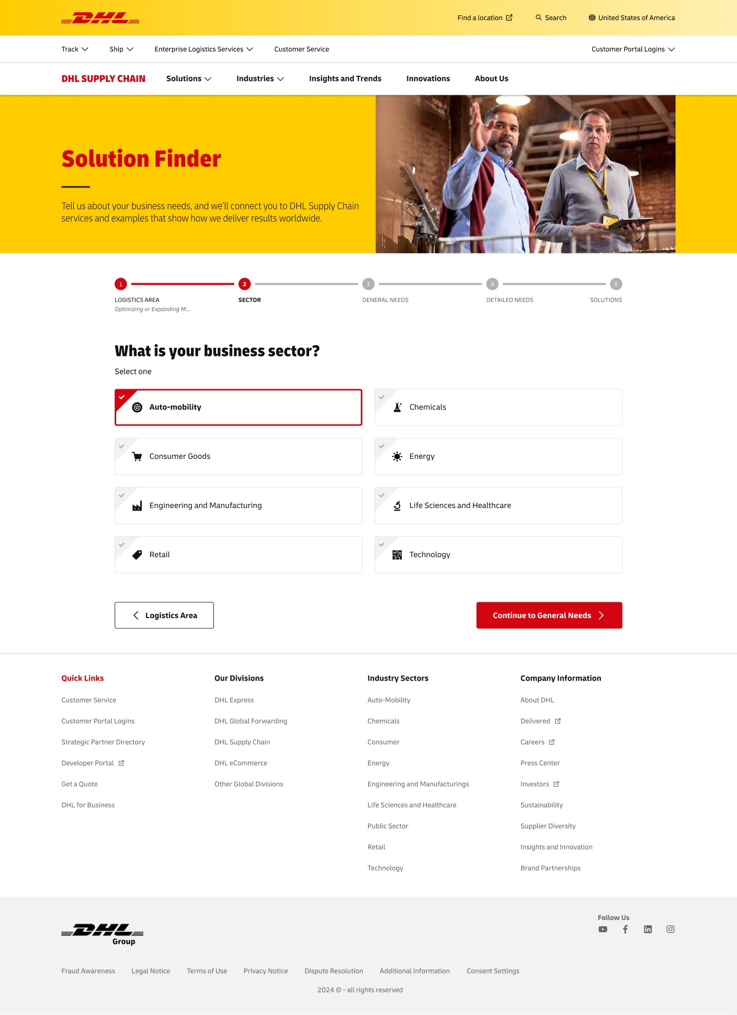 This is the most complex flow of this experience. It is designed to ask a series of questions to help narrow down what solutions the customer needs and connect them to more information. The biggest challenge with this design was the detailed needs section. Narrowing down was difficult with the data, so our team landed on this accordion approach to help divide them into sections to not overwhelm the user.
